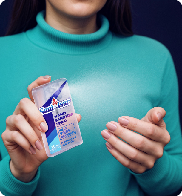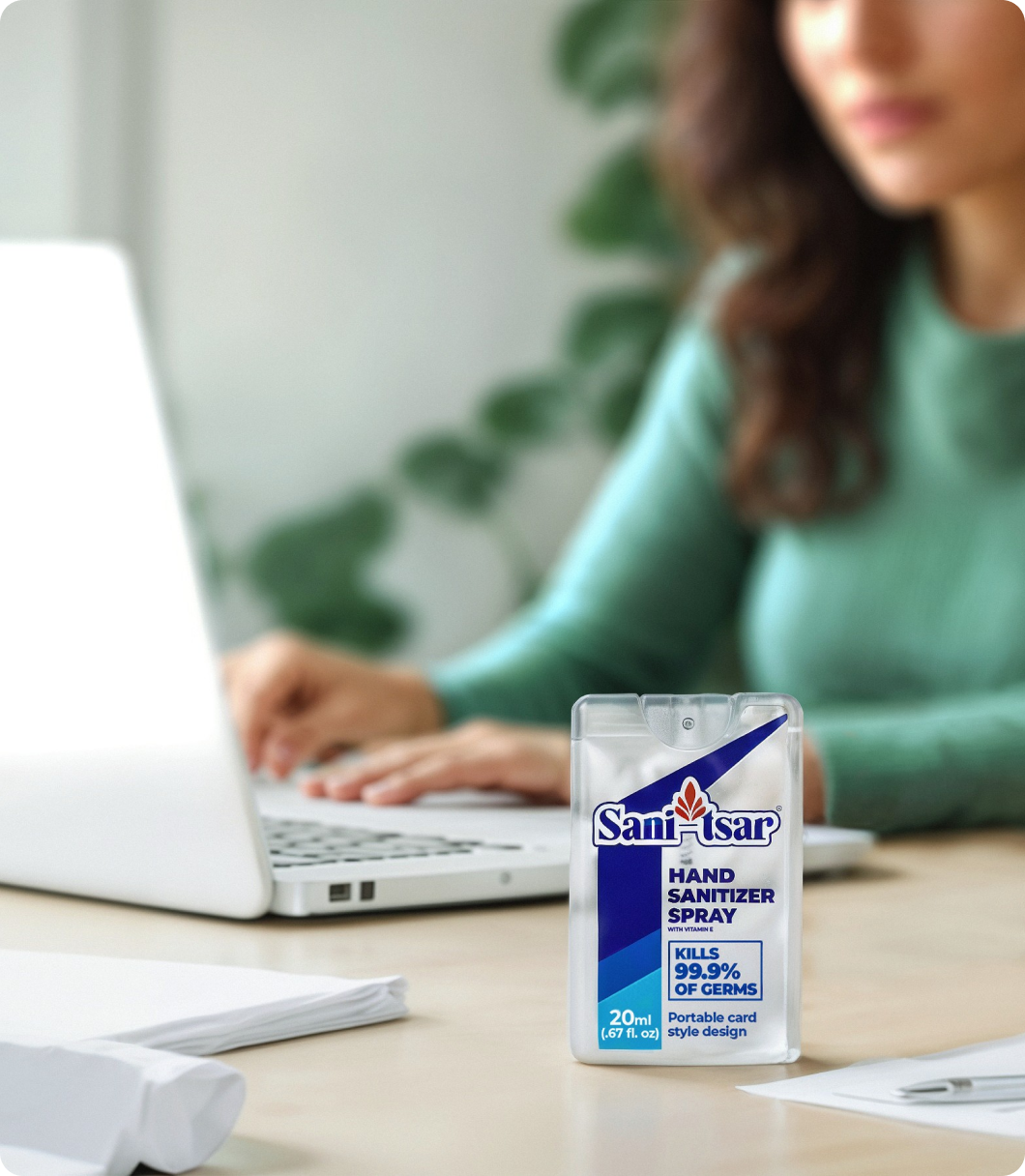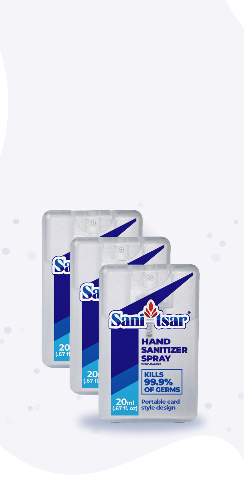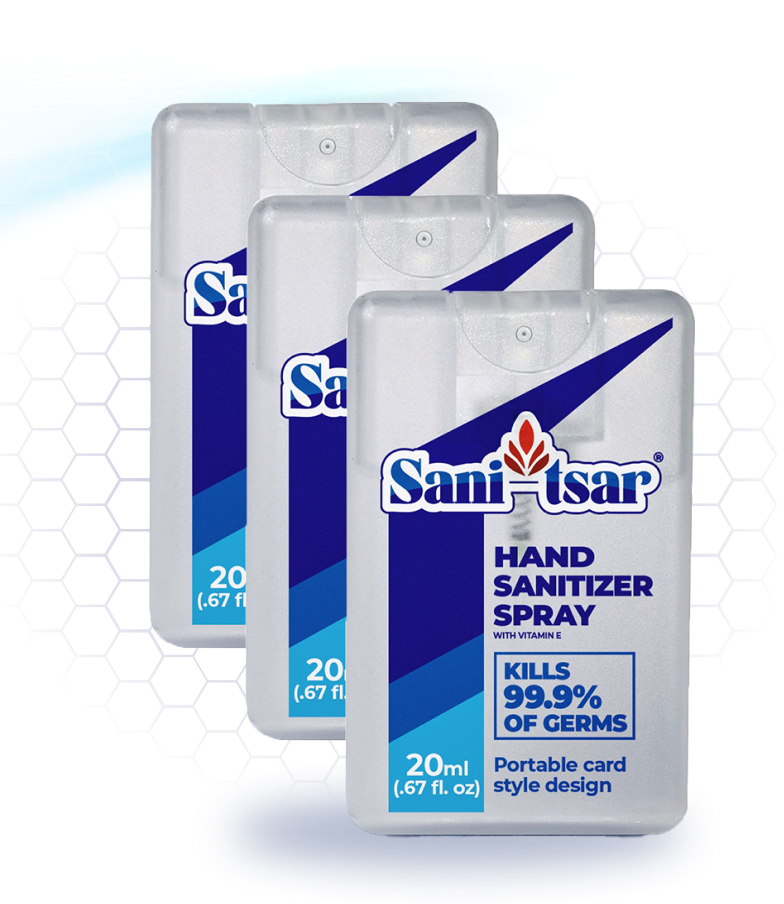 Sani-Tsar is a portable, card-style hand sanitizer spray designed for on-the-go use. It effectively kills 99.9% of germs and bacteria while moisturizing your hands with vitamin E.